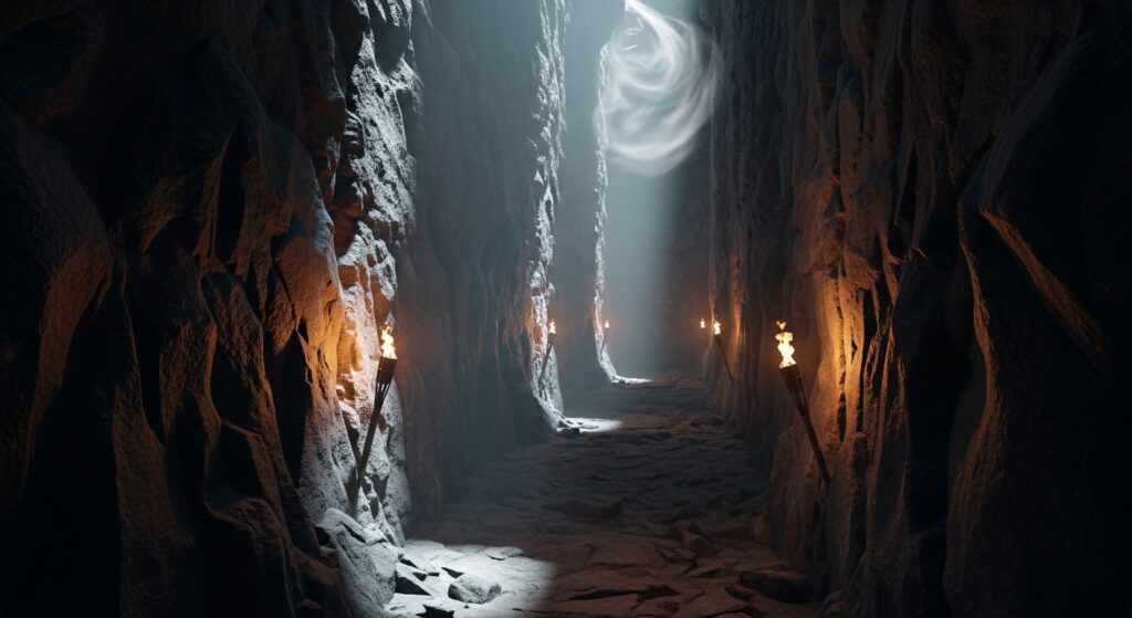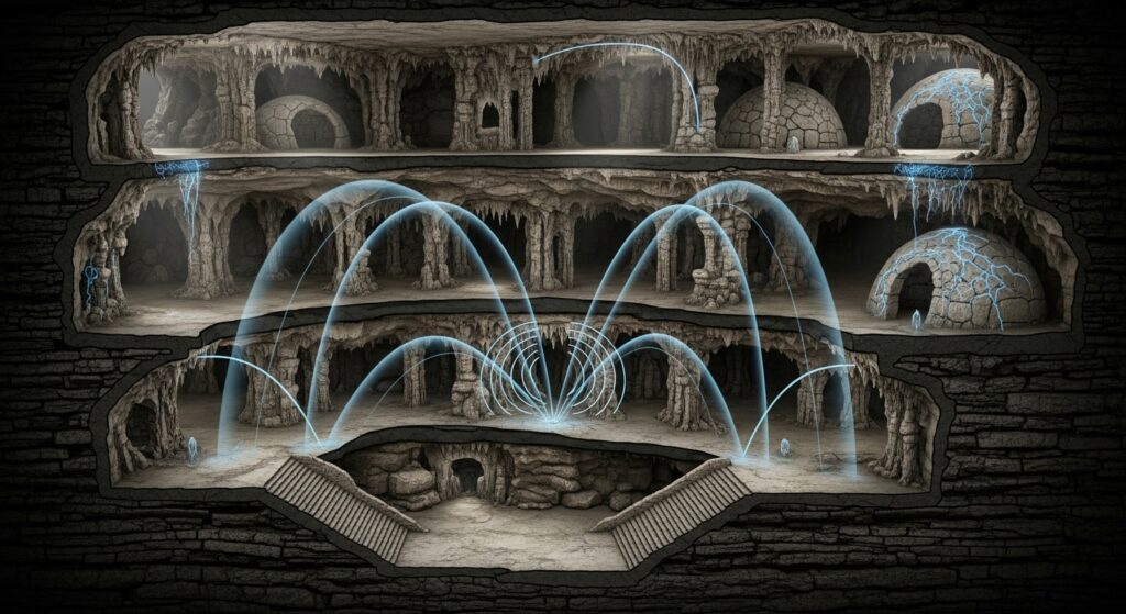 無数の通路・裂け目・小ホール・水路が入り組んでいる。