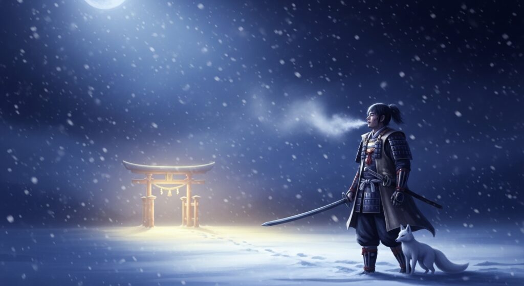 それを見た者は皆、同じ夢を語る。 ――満月の下で、一人の武者が白狐とともに北の海へ歩いていく夢を。