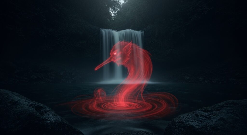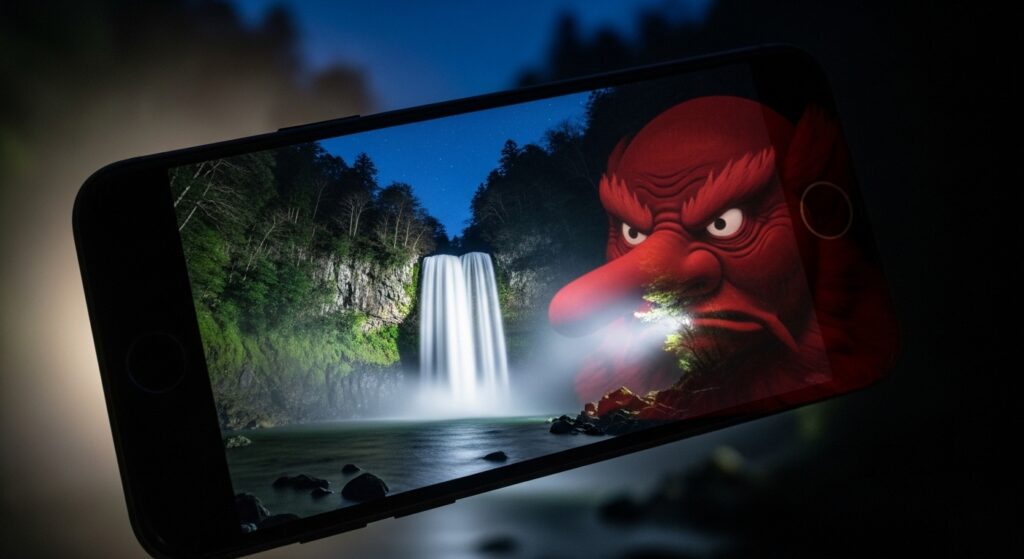 「滝の写真を撮ったら、赤い影が写っていた。」