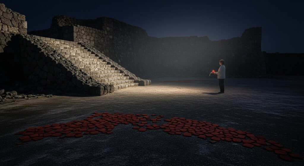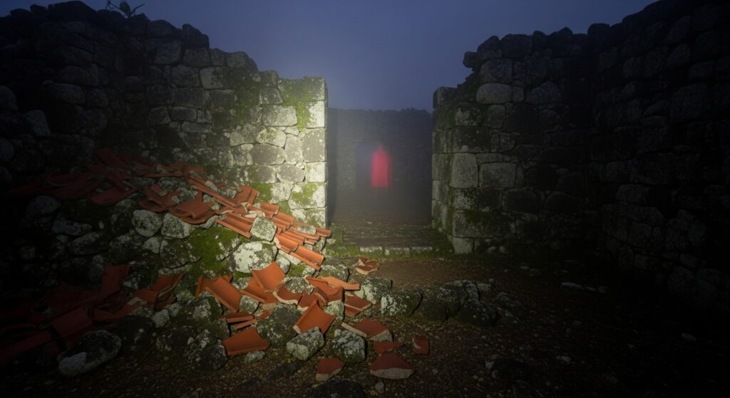 風は湿り、石垣には苔がうっすらと生え、月明かりが瓦の残骸を銀色に照らしていた。