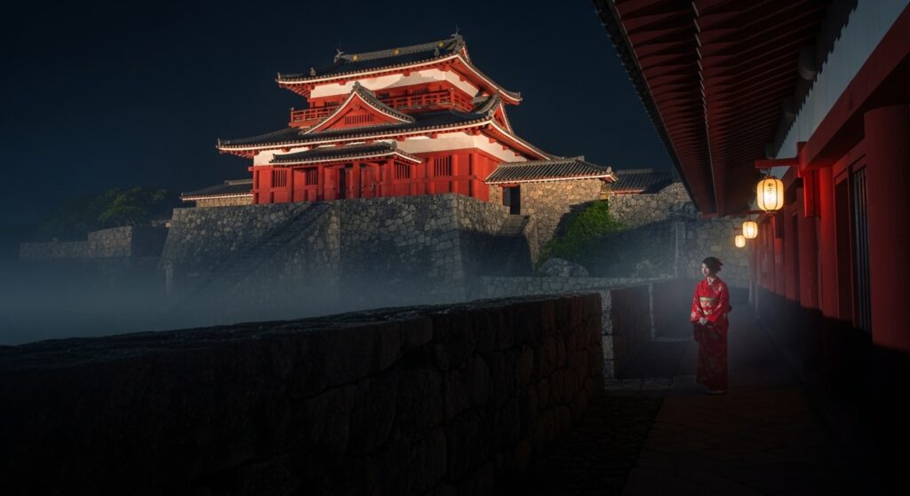 - 焼失直前の夜、正殿の瓦屋根越しに “赤い着物” が揺れて見えた。