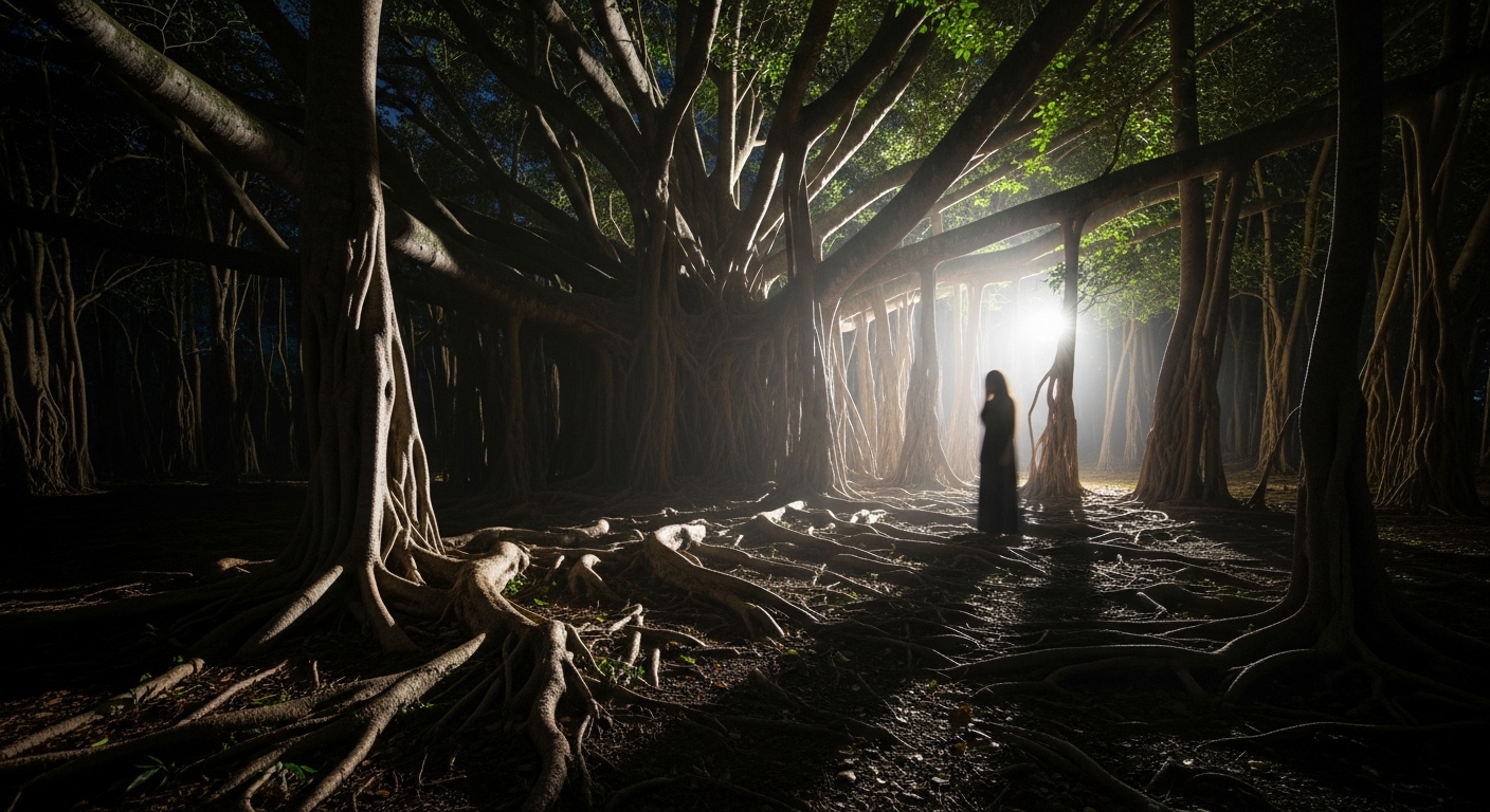 成熟したガジュマルの根群は、風を取り込み、空気を揺らし、夜間冷えることで軽い共鳴を起こしている可能性がある。これが「すすり泣きのようだ」と感じられる要因となるだろう。