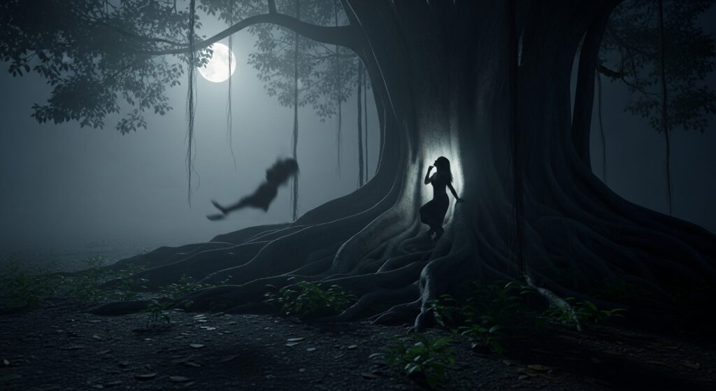 22時過ぎ、木陰でひとり耳を澄ませた。木の根元近くで、遠くで女性のすすり泣きのように聞こえるという噂がある。僕には、確かな“声”は聞こえなかった。ただし、次のような“音の揺らぎ”を感じた: