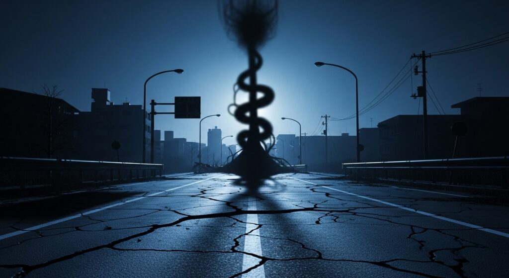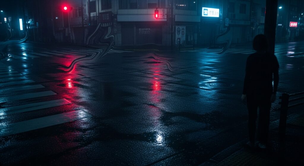 ただの道路なのに、息を飲むほどの不気味さが生まれる瞬間。